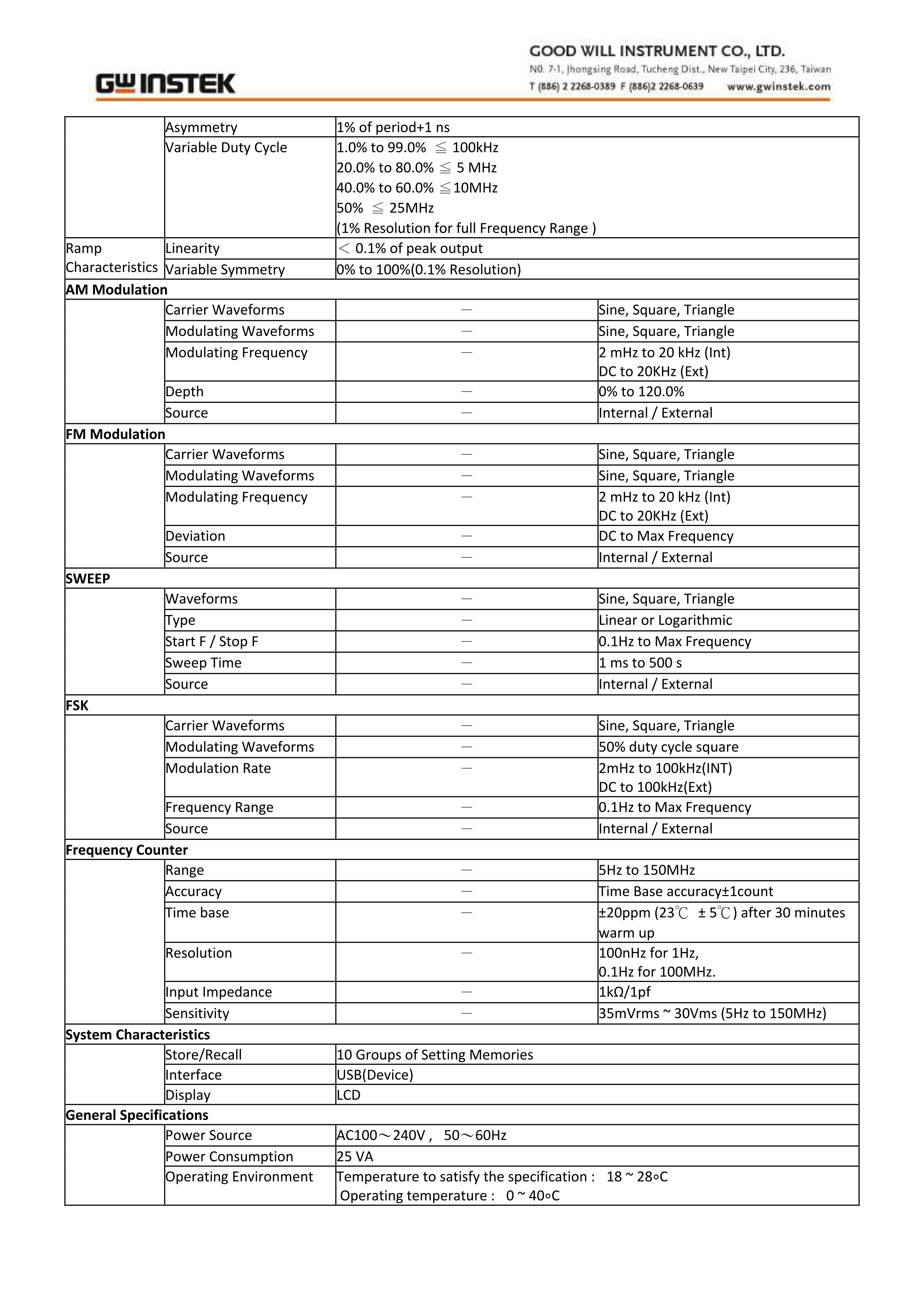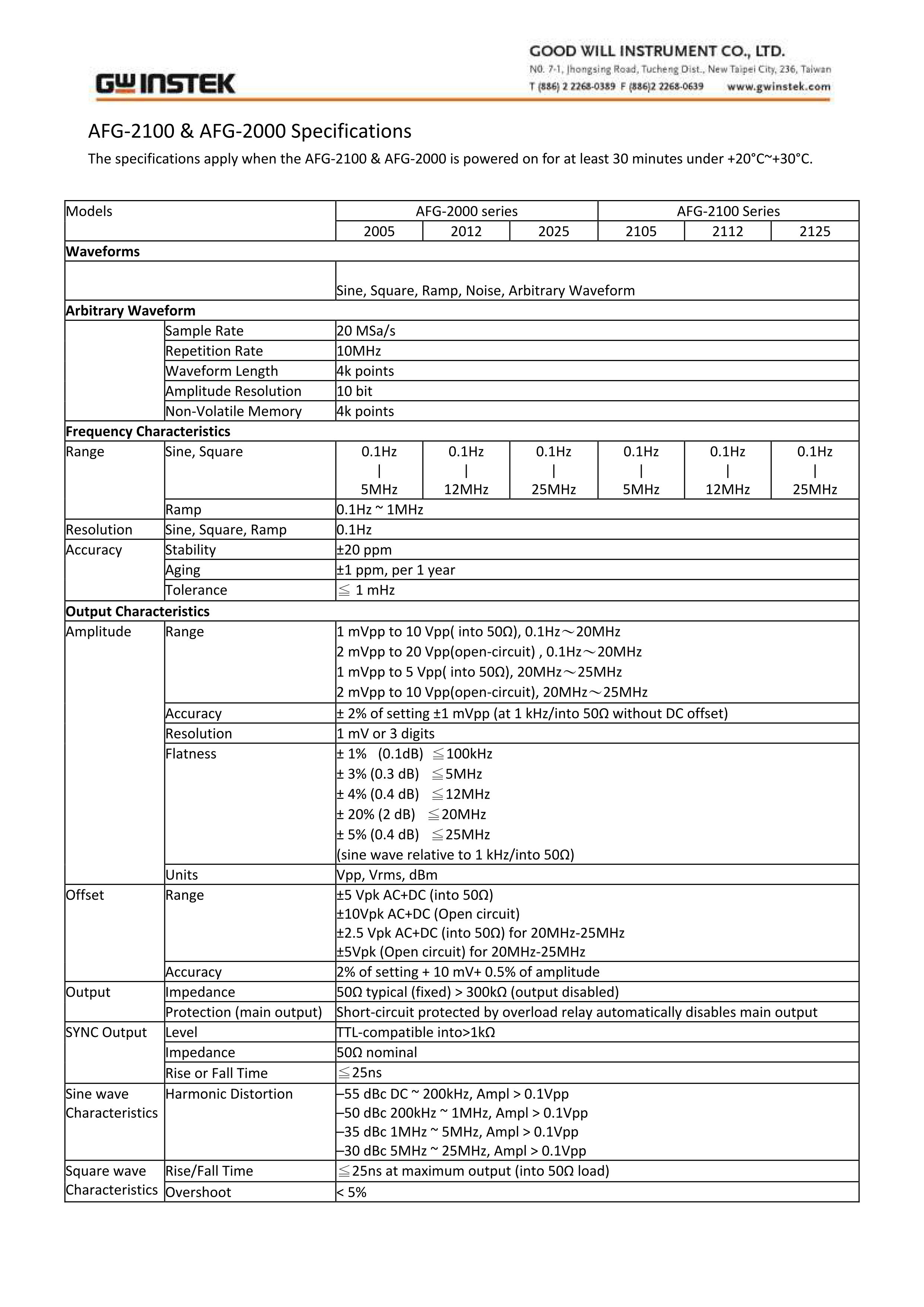 The AFG-2100/2000 Series includes 6 models in three frequency bands of 5MHz, 12MHz and 25MHz. Besides the basic features of the whole AFG-2100/2000 Series, AFG-2100 also carries additional features of AM/FM/FSK Modulation, Sweep, and Frequency Counter.