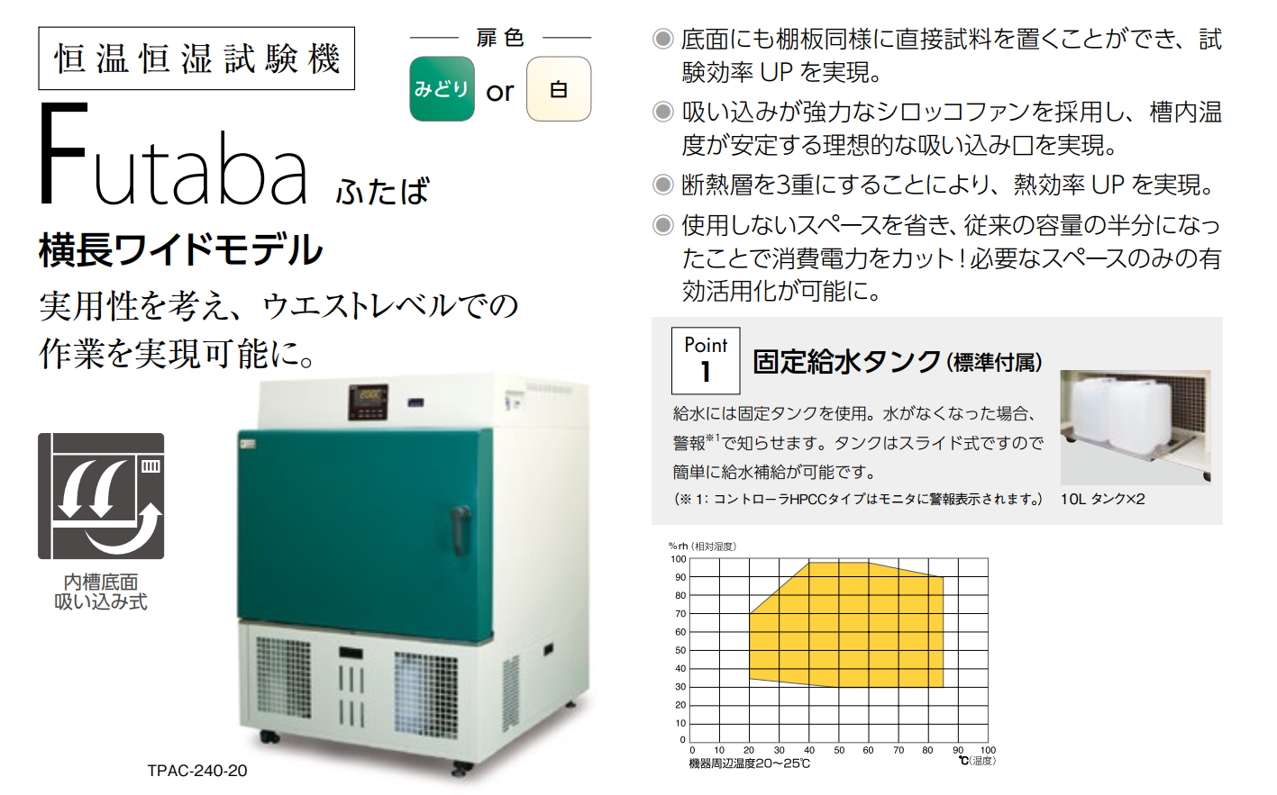The midori series od constant temperature and humidity testers is a power saving model aiming at 1/2 the amount of electric power. It is designed to demonstrate high performance with low power consumption. we will radically change the conventional structure, adopt new meterials, and propose new usage methods. It minimizes the power required by the product and emits extremely little heat, reducing the load on the air conditioner in the room.