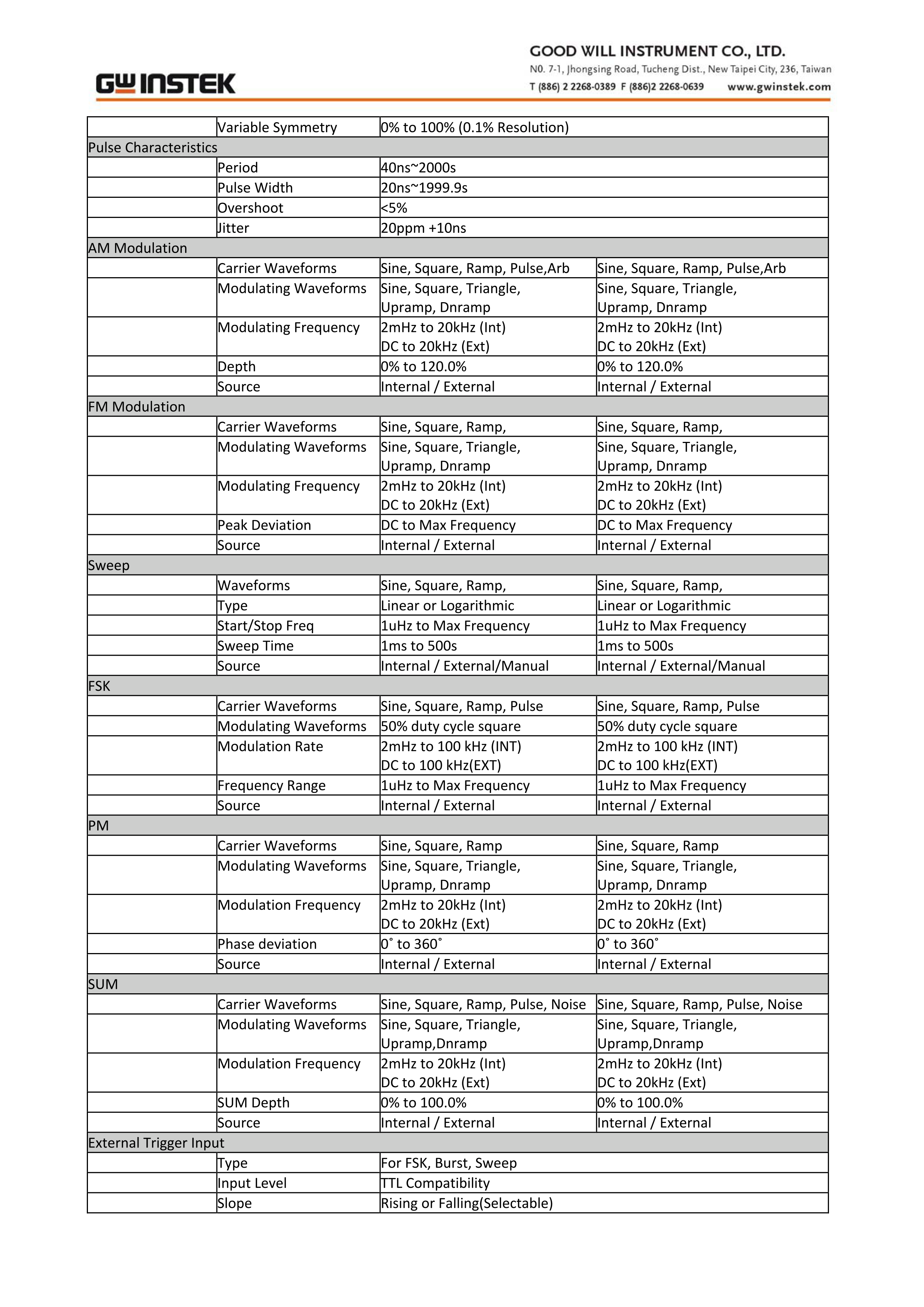 The major features for both channels include 10Vpp output amplitude; 25MHz frequency bandwidth with 1uHz resolution; built-in waveforms of Sine, Square, Ramp (Triangle) and Noise. As to the 1%~99% adjustable duty cycle of Square waveform can be used as pulse signal sources. For the arbitrary waveform, user can edit the 66 built-in waveforms or create a whole new one. Moreover, AFG-2225 carries features of AM/FM/PM/FSK/SUM Modulation, Sweep, Burst and Frequency Counter, which can be applied to various communication fields.