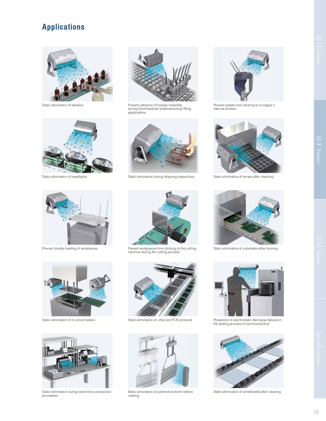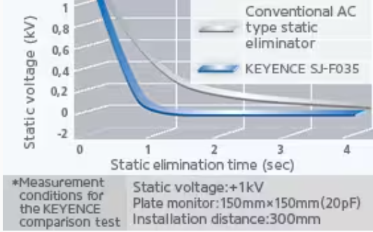 The high-power, wide-area fan increases the air volume three times over that of conventional models. Moreover, the lossless structure minimises air resistance as much as possible. In spite of its small size, the SJ-F300 Series has a 2 times larger static elimination area compared to conventional models. It is especially effective for eliminating static electricity in cellular manufacturing assembly processes or from precision components.