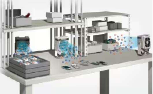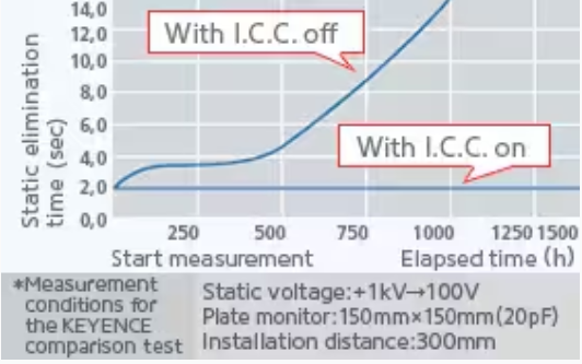 Each blower is equipped with the I.C.C. control system, so individual blowers supply ions according to the charge level when static is eliminated in multiple locations at the same time, such as in cell manufacturing processes, and when static is eliminated by multiple inspectors individually, such as in inspection processes. This enables the optimal static elimination environment.