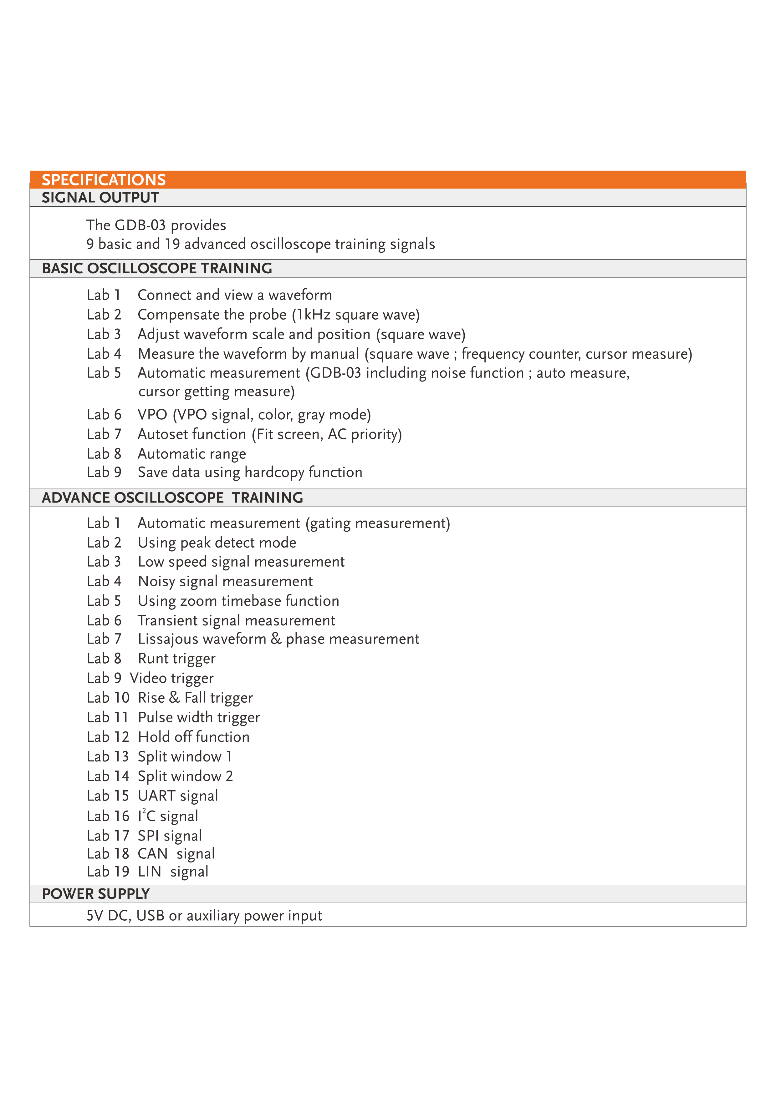 With the GDB-03 training kit and the included curriculums, you are able to acquire adequate knowledge in using a DSO with advanced features.